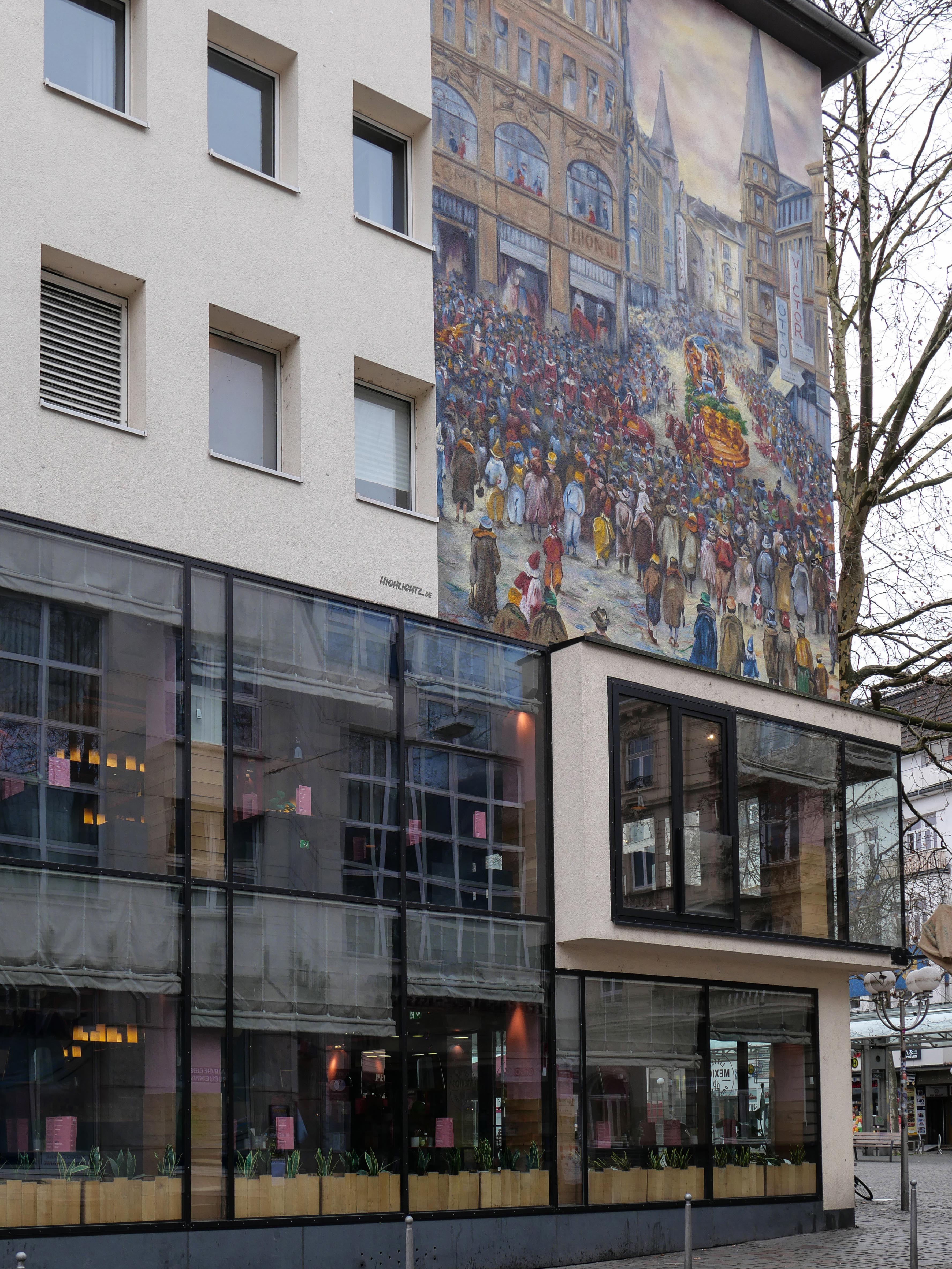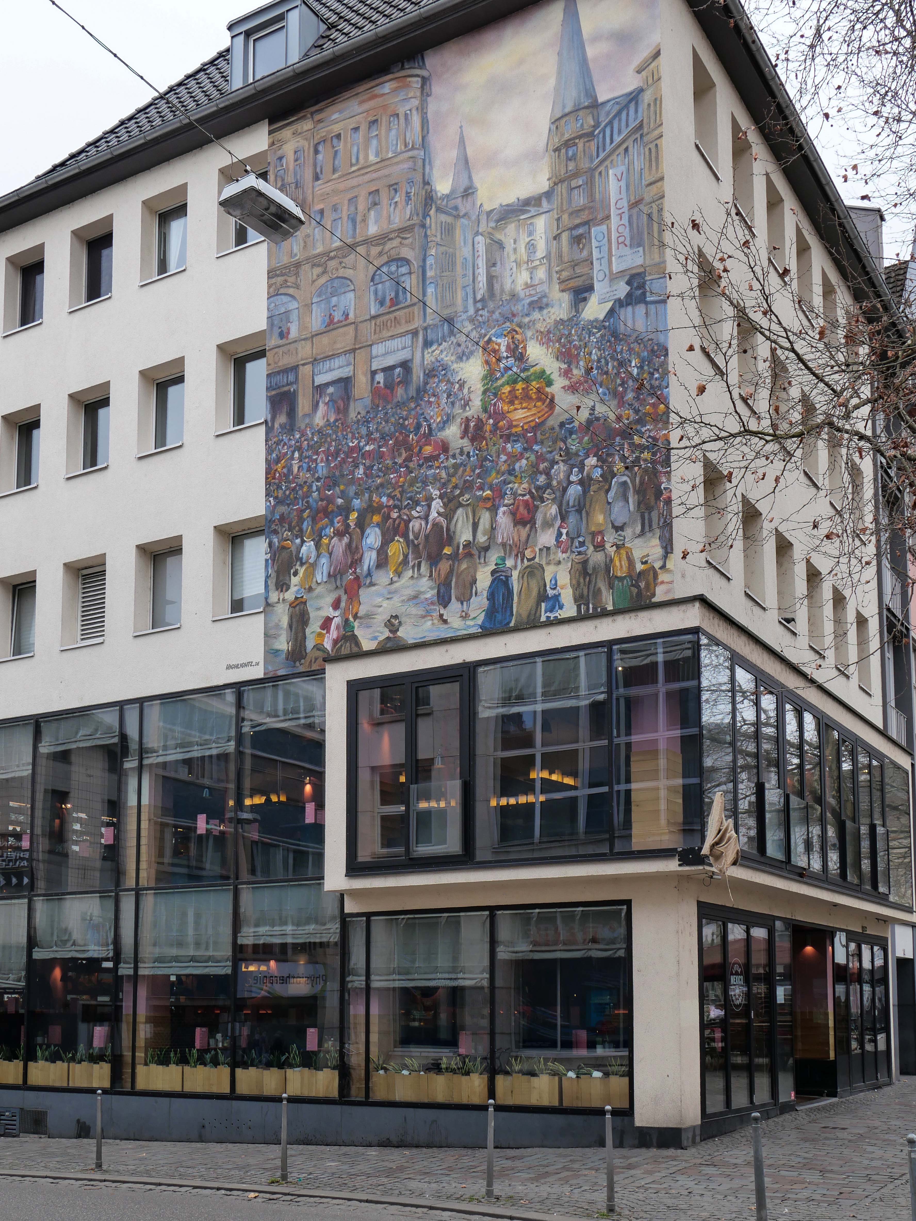 Mit der Reihe »Walls of Vision« realisiert die Stiftung seit mehreren Jahren großflächige Fassadengemälde - sogenannte Murals, für die Urban-Art-Künstler historische Kunstwerke aufgreifen und in zeitgenössischer Interpretation in den öffentlichen Raum holen. Im November 2025 wurde das Karnevals-Mural an der Fassade des Eckhauses Friedensplatz/Friedrichstraße ausgeführt, als Vorbild diente das Gemälde Prinz Heinz V. Karneval 1936 in Bonn des Bonner Malers Carl Nonn (1876-1949). Der auf Freiluftmalerei spezialisierte Nonn war selbst begeisterter Karnevalist. Lena Ortmann und Stefan Vogt vom Künstlerkollektiv Highlightz übertrugen sein Gemälde in ein monumentales Format und blieben dem Originalmotiv dabei weitgehend treu.