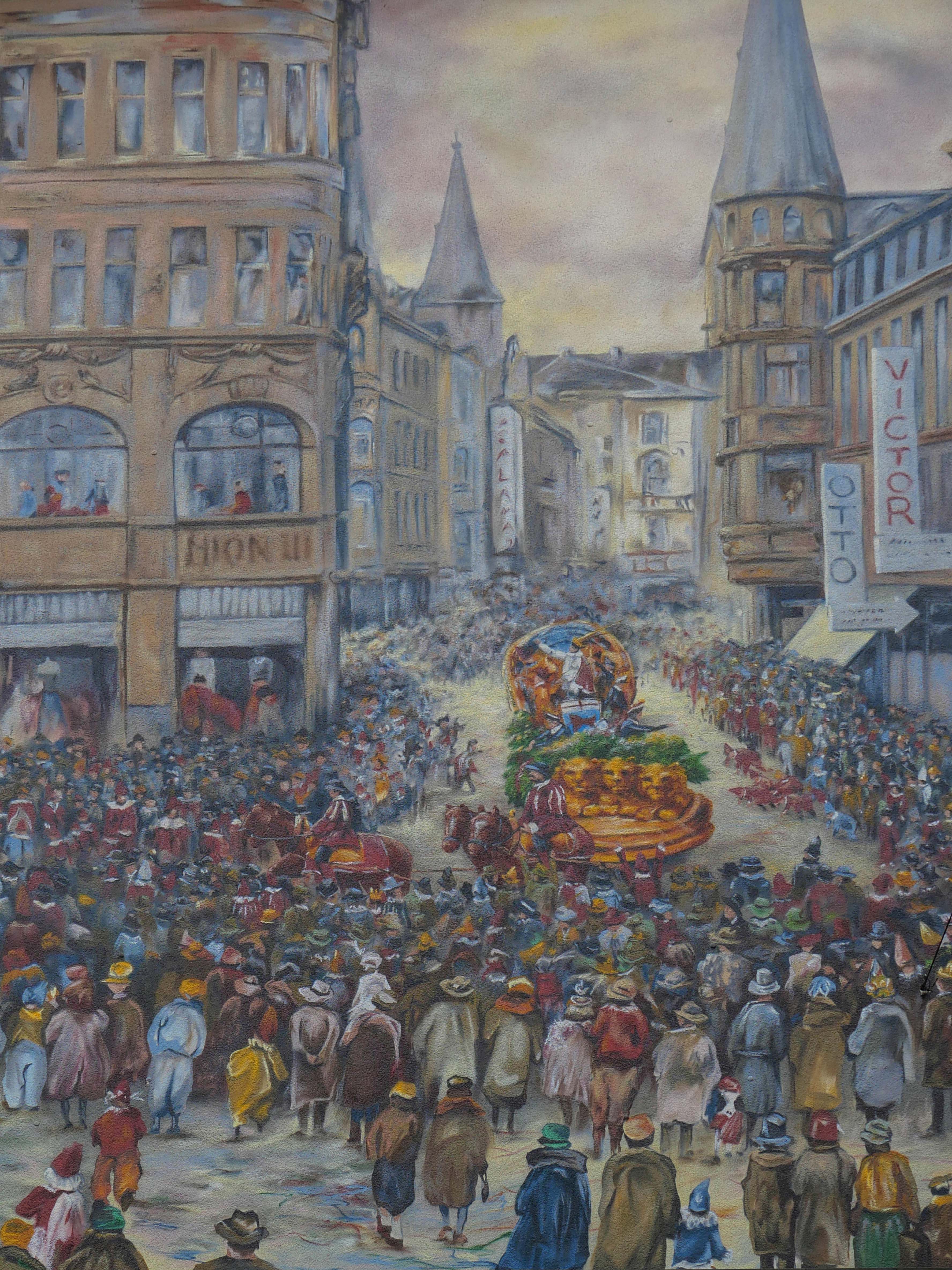 Die Szene zeigt den Bonner Rosenmontagszug vor 90 Jahren und macht die traditionelle Verwurzelung des Karnevals deutlich. In der historischen Stadtkulisse ist der prunkvolle, von einem Pferdegespann gezogene Festwagen des Prinzen der Mittelpunkt des Geschehens. Goldglänzend und mit drei Löwenköpfen verziert, biegt er gerade auf den Remigiusplatz ein. Menschenmengen säumen den Zug, die zumeist verkleideten Zuschauer drängen sich auf der Straße oder verfolgen das Geschehen aus den Fenstern, Kinder bücken sich, um Kamelle einzusammeln. Die auf 1936 datierte Szenerie unterscheidet sich also nur wenig vom heutigen Straßenkarneval. Das bunte, festliche Treiben hat eine zeitlose Gültigkeit, das gemeinsame Feiern der ausgelassenen Jecken setzt alljährlich für kurze Zeit die Konventionen außer Kraft.
