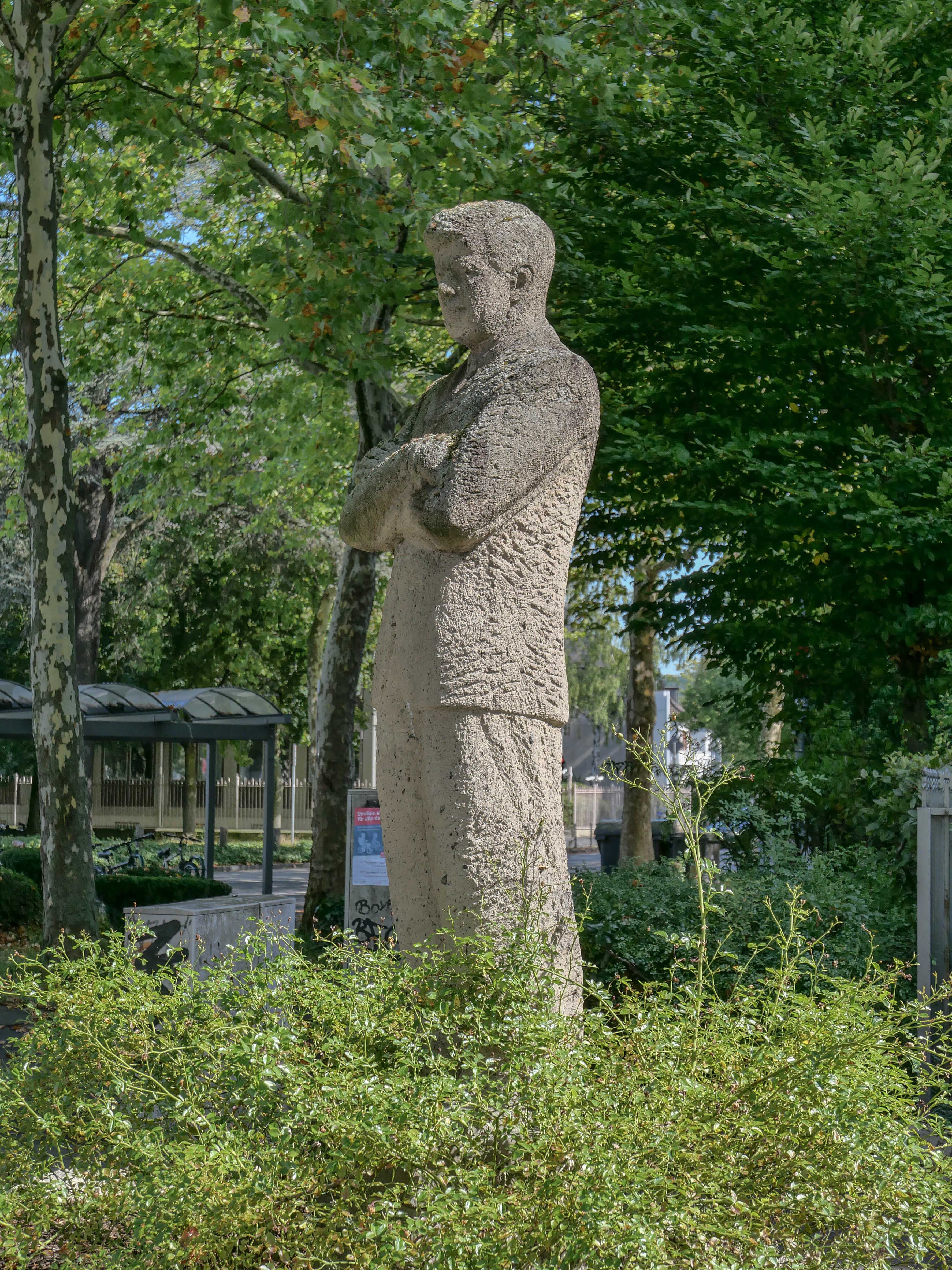 »Das auf Vorgabe des Architekten naturalistisch aufgefasste Denkmal aus Weiberner Tuffstein knüpft in seiner äußeren Form an traditionelle Standbilder an. Auf einem niedrigen, einfach profilierten Sockel erhebt sich die Figur Kennedys in Lebensgröße, bekleidet mit einem schlichten zeitlosen Anzug, die Arme lässig vor der Brust verschränkt. Im glatten, jugendlichen Gesicht des Politikers spiegelt sich ein angedeutetes Lächeln, der Blick ist nachdenklich nach vorne gerichtet.«