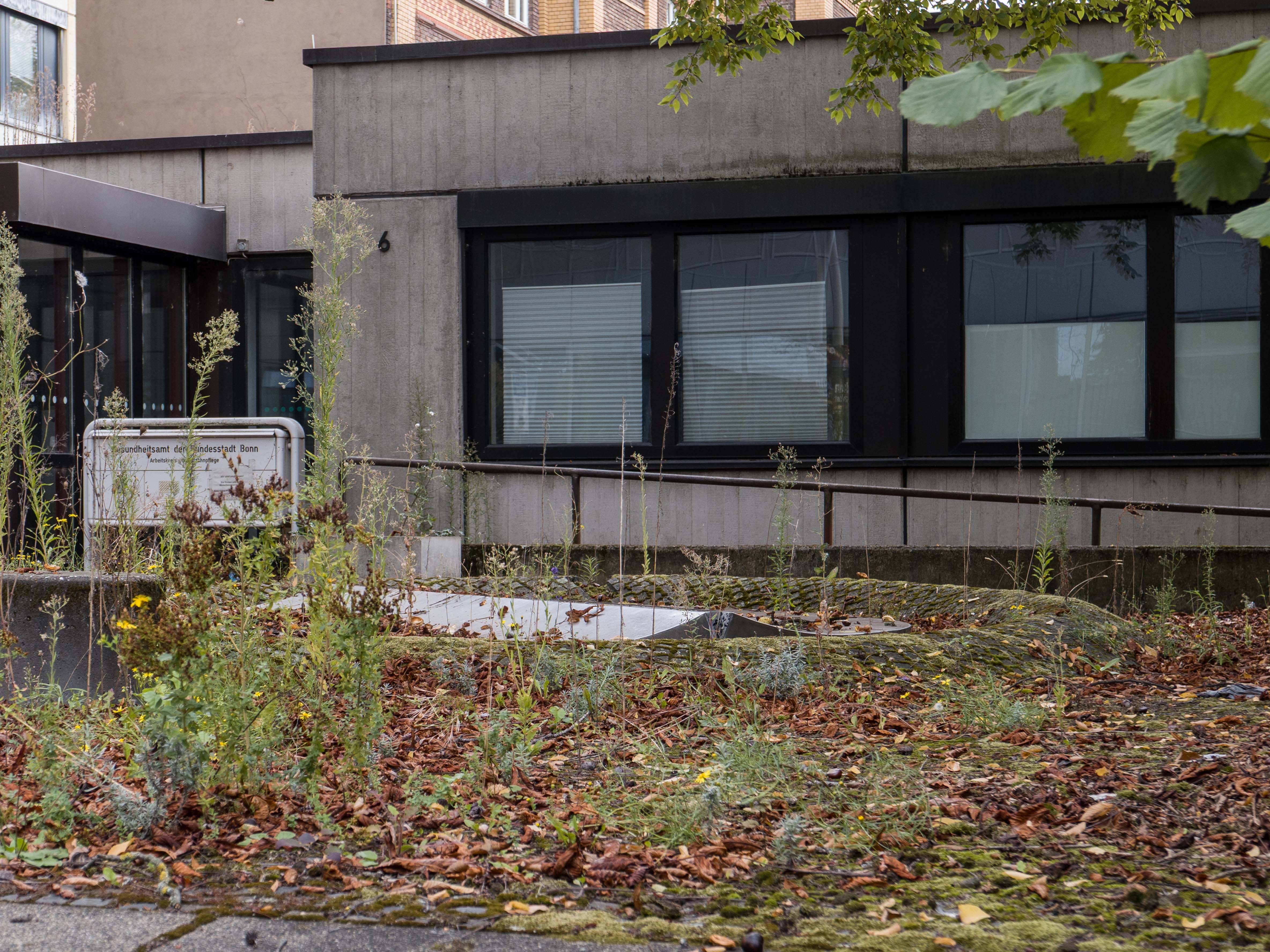 »1978 schrieb die Stadt Bonn einen beschränkten Wettbewerb für die Außenanlage zwischen altem und neuem Gesundheitsamt aus. Einstimmig entschied sich das Preisgericht für den Entwurf von Victor Bonato. Sein Brunnen akzentuiert den kleinen Vorplatz durch eine mattgeschliffene konkav gewalzte Ronde, die versenkt eingebettet im gepflasterten Boden des Platzes liegt. Sie ist auf der Achslinie so geteilt, dass ein Spalt entsteht, der gleichzeitig Wasser- und Lichtquelle ist, da hier eine Neonröhre eingesetzt wurde. Das Wasser strömt aus dieser Fuge und fließt als Film über die Scheibenhälften zu den Außenrändern der Ronde. Mit dieser Konstruktion setzt der Künstler dem harten Material Stahl und der Präzision der Form das lebendige Element des Wassers entgegen, das als Symbol für Heilen und Gesunderhaltung gerade für ein Gesundheitsamt besonders geeignet ist«