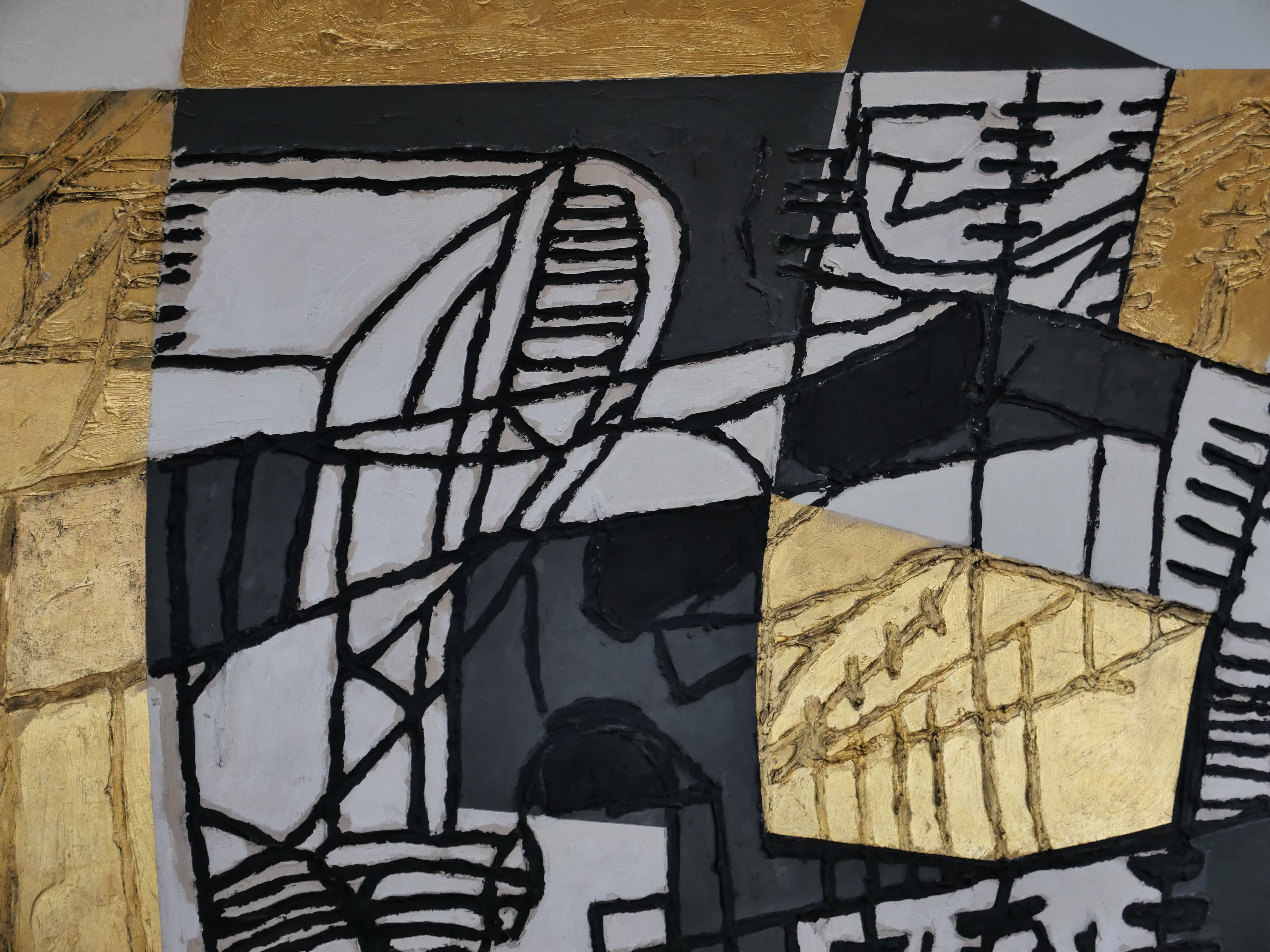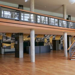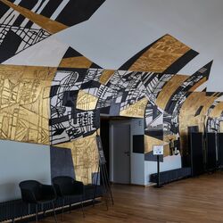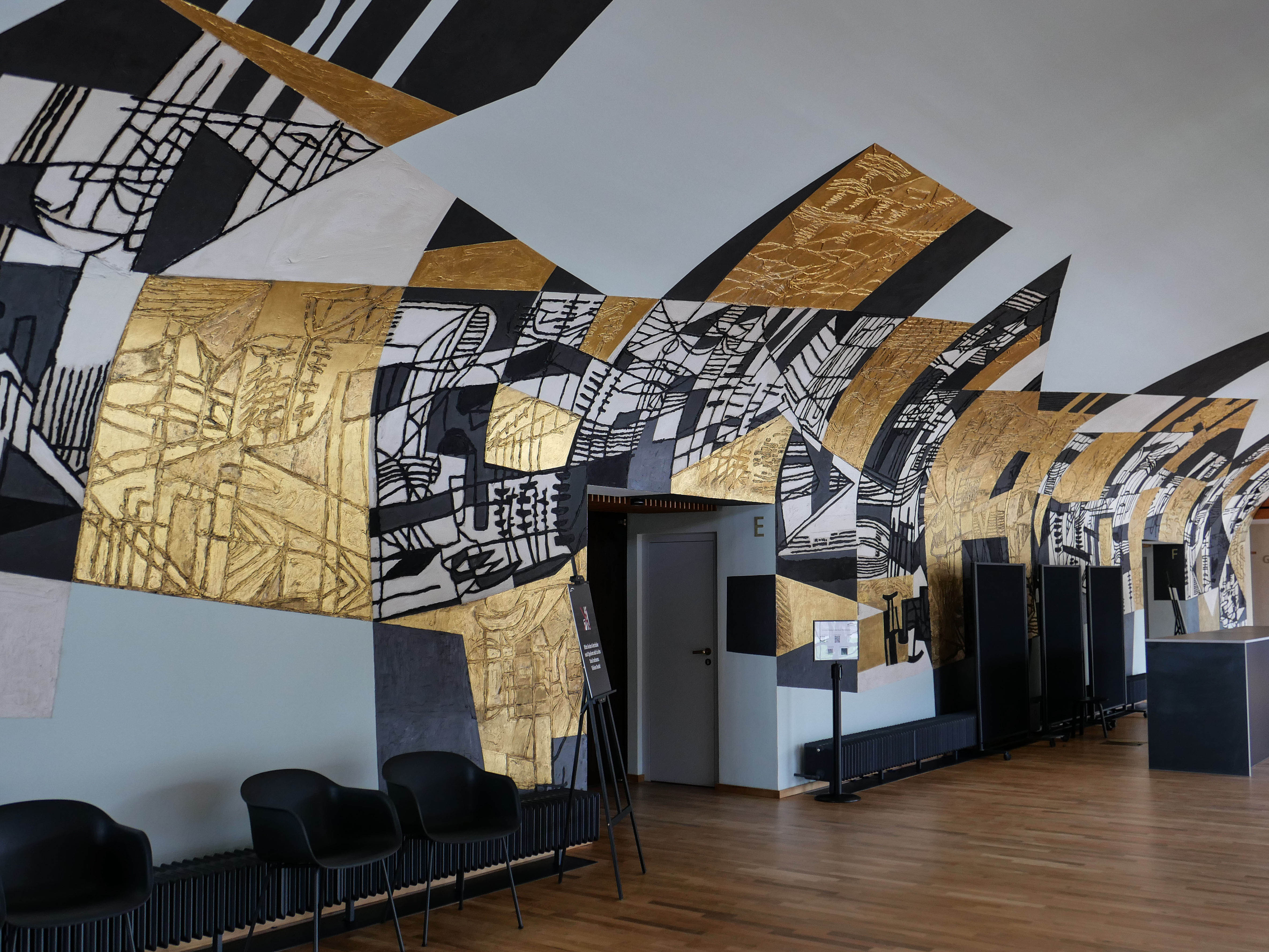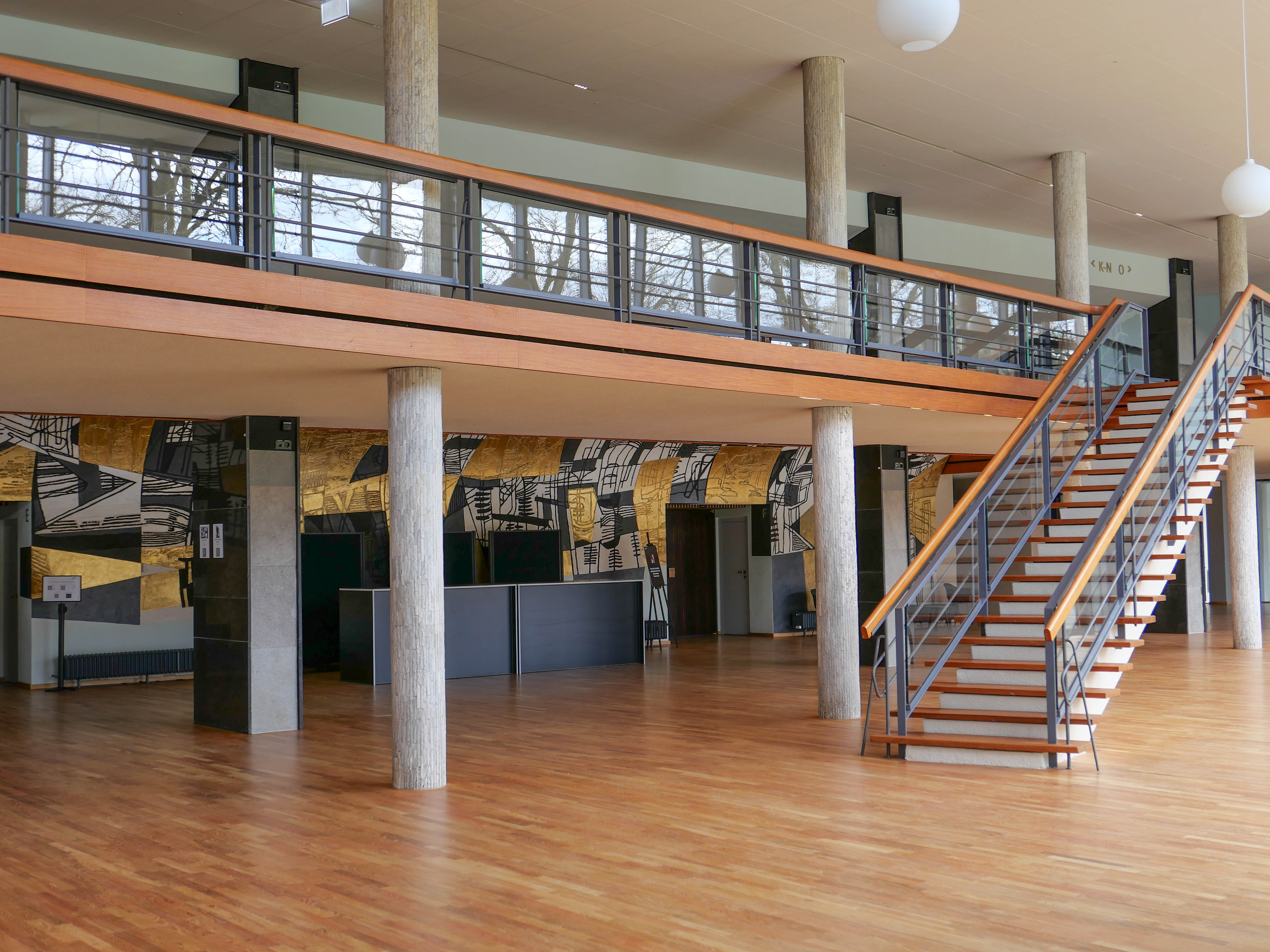 »Die monumentale Wandmalerei an der gekrümmten Stirnwand des Großen Foyers darf als das bedeutendste Kunstwerk in der Beethovenhalle gelten. (...) Die Malerei überzieht nicht die gesamte Wandfläche, sondern akzentuiert beispielsweise die Türen, womit der Effekt erzielt wird, dass man beim Gang zum Großen Saal durch ein Kunstwerk schreitet. Die dick aufgetragenen Farben entfalten reliefhafte Qualitäten und sind in sich wiederum durch ein fein strukturiertes Liniennetz gegliedert. Bestimmend für die fast sakral anmutende Wirkung ist aber vor allem die Materialwirkung des Goldes, das aufwendig von einer Kölner Spezialfirma mit Achatsteinen aufgeschliffen wurde. (...) Ganz bewusst gab der Künstler der Wandmalerei keinen Titel. Statt dessen kam es ihm darauf an, eine Offenheit für verschiedene Betrachtungsweisen der Gestaltung anzubieten.«