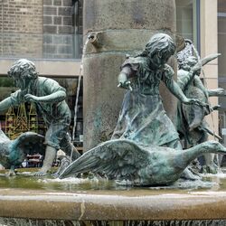 Darunter, in einem zweiten Wasserbecken, sind in locker kreisender Bewegung drei weitere Gänse einfangende Kinder angeordnet. (...)