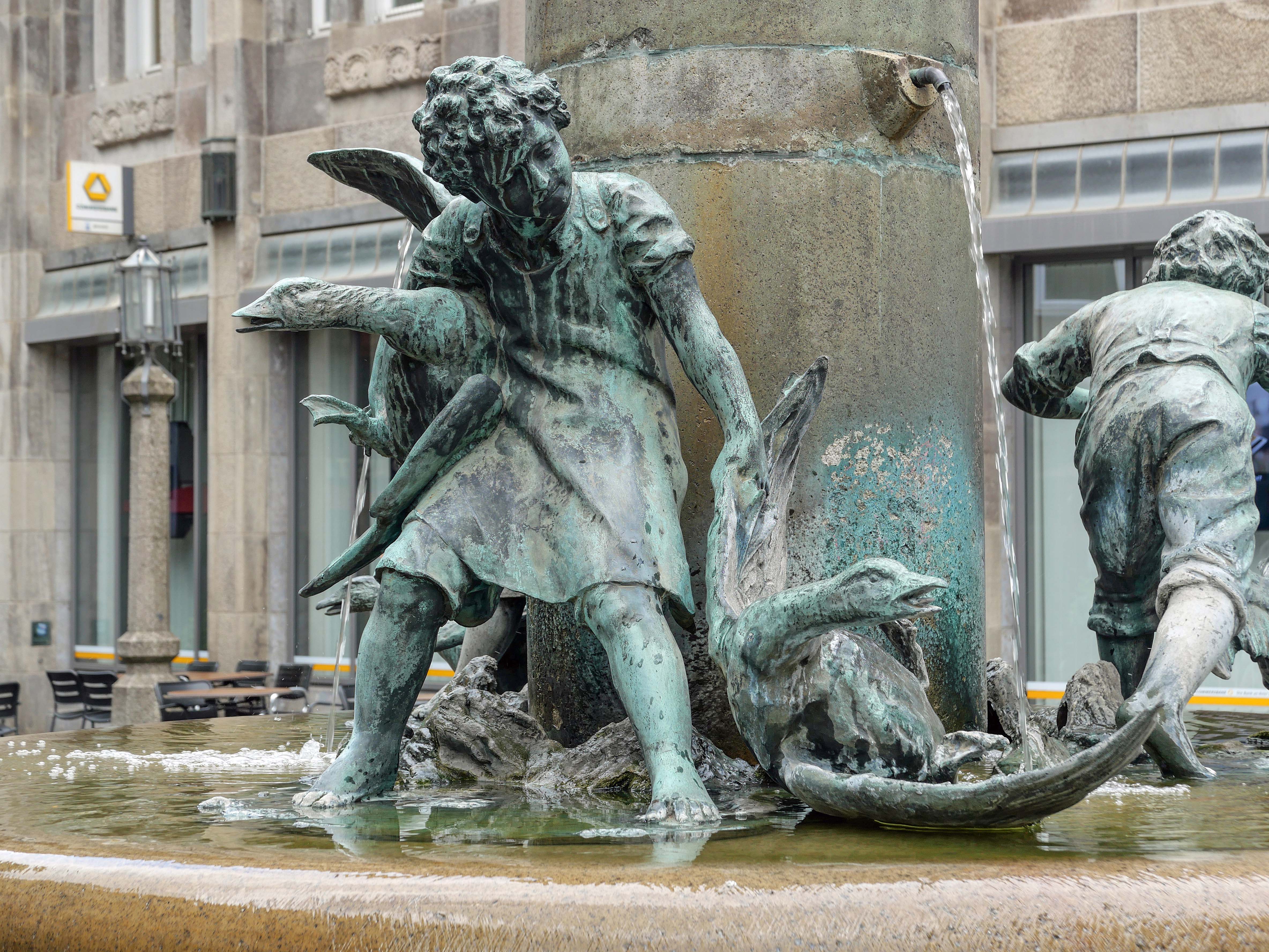 Aus einer großen, flachen, runden Brunnenschale steigt eine schlichte, untergliederte Brunnensäule empor, die von der Bronzefigur eines realistisch dargestellten, barfüßigen Gänsehirten mit einer Stocklaterne bekrönt wird. Zwischen seinen Beinen befindet sich eine flatternde Gans, die der sich leicht bückende Junge im Begriff ist, mit der rechten Hand zu greifen. (...)