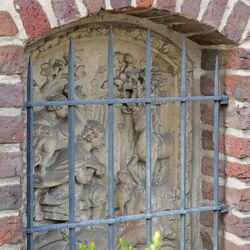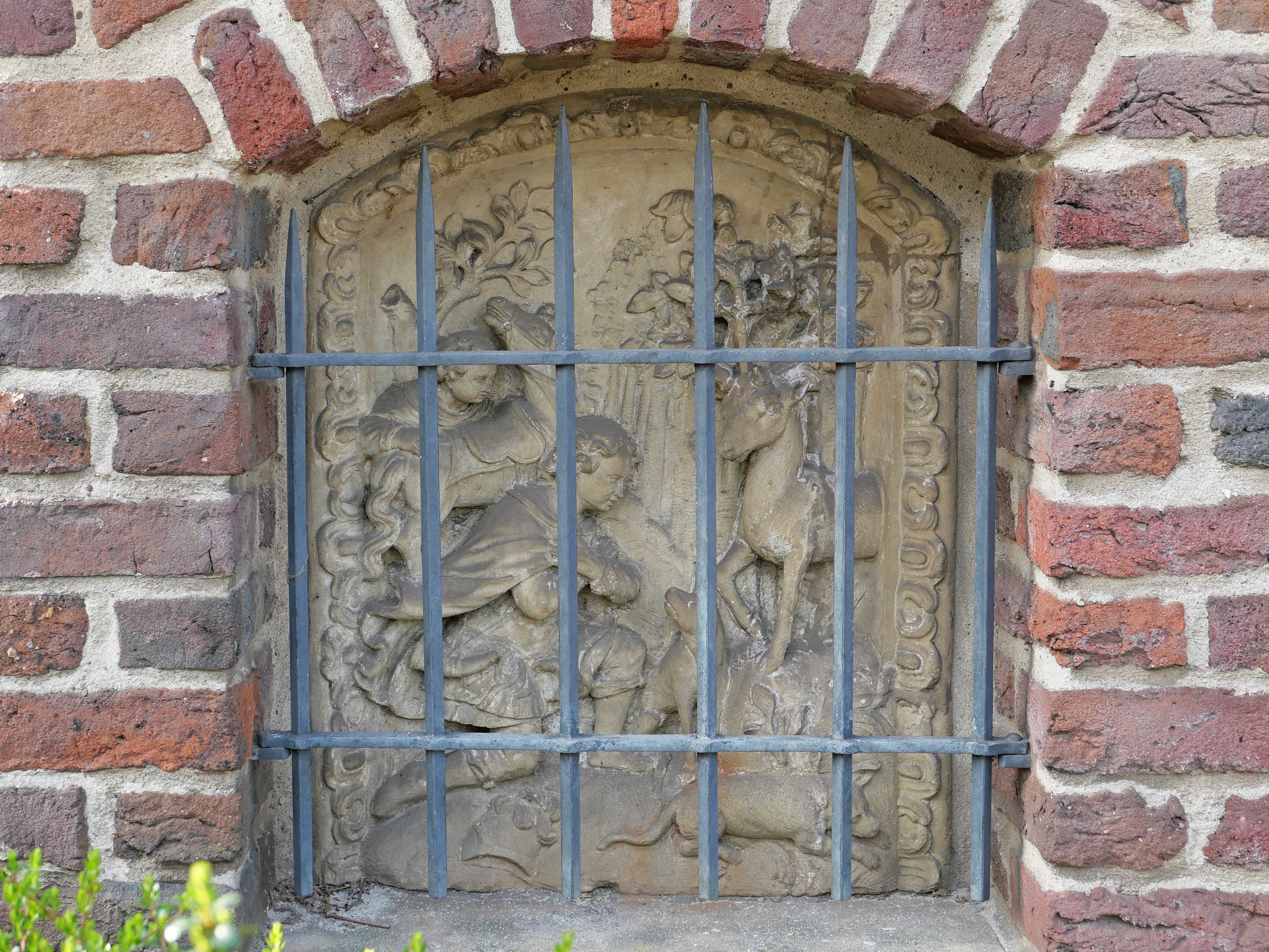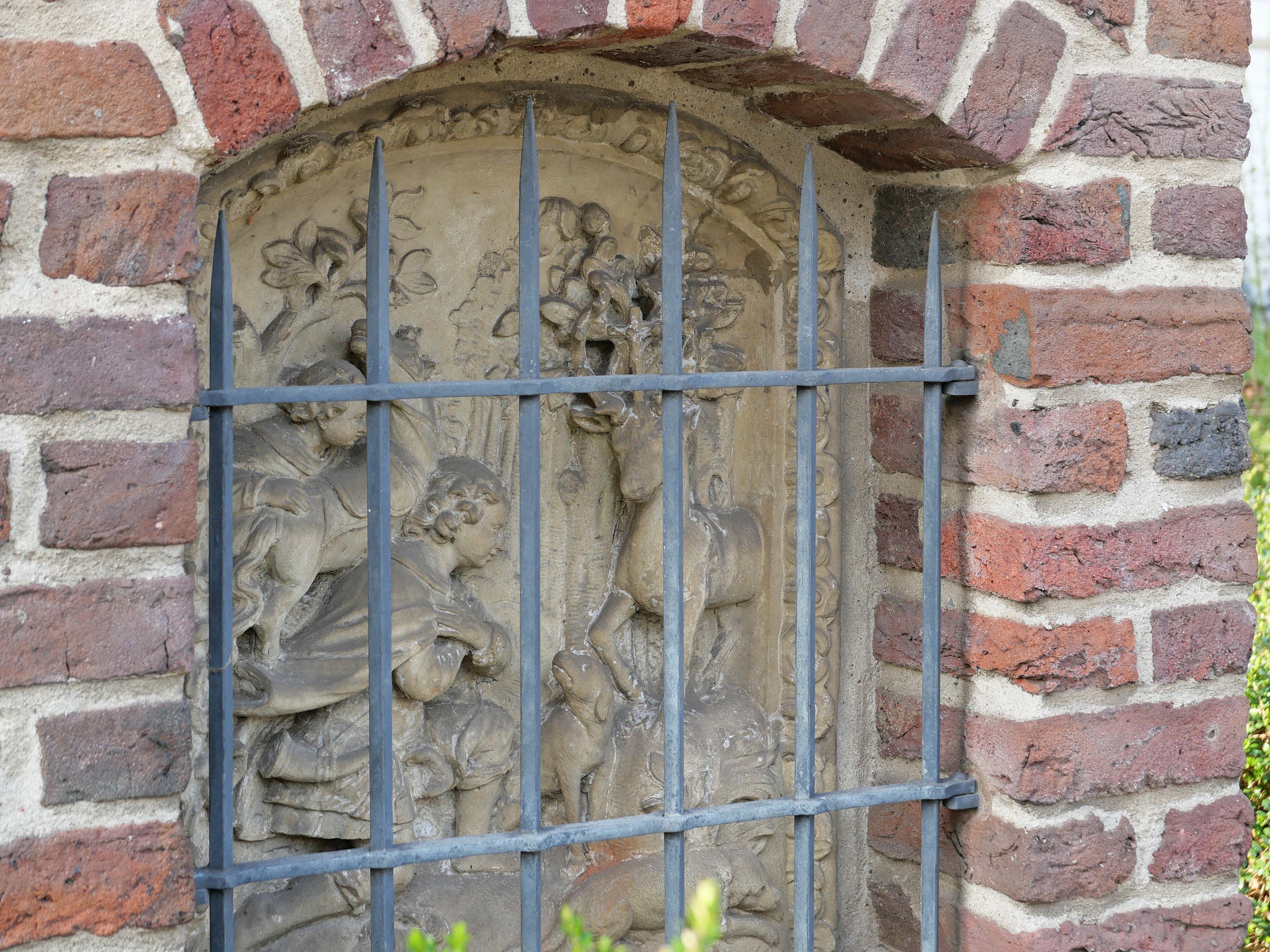 In dem aus Ziegelstein errichteten, etwa 2,50 m hohen und 1 m breiten mit Satteldach über dem Giebeldach abgeschlossenen Heiligenhäuschen wird in einer vergitterten Rundbogennische auf einer Kalksteinplatte (18. Jh.) die „Hirschersscheinung des hl. Hubertus“ dargestellt. Unter vorspringender Ablage kündet auf eingelassener Tafel die Inschrift „St. Hubertus - Schutzpatron der Jäger“.«
