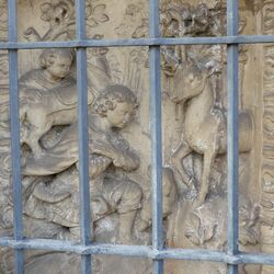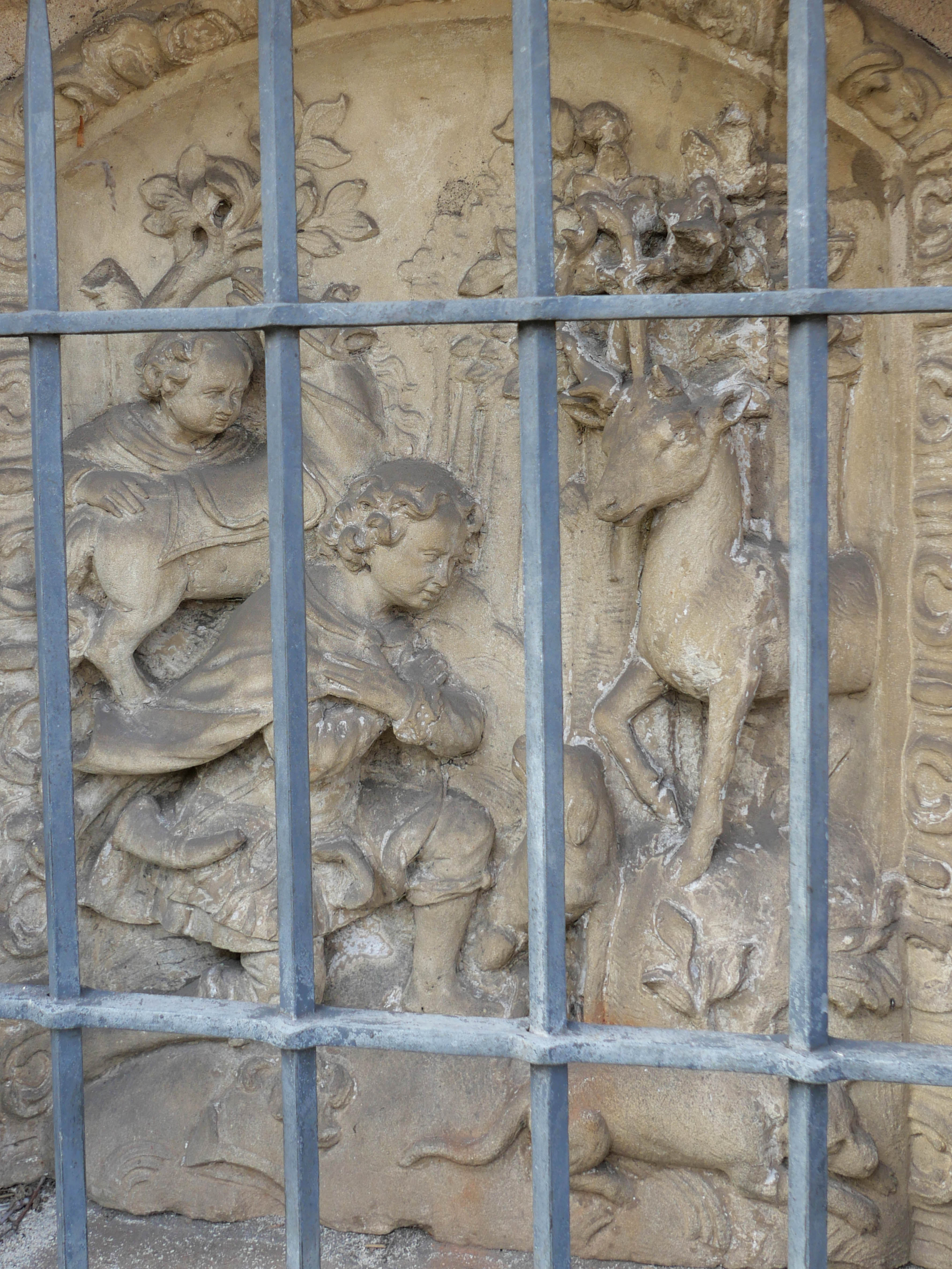 »Ecke Botanischer Garten und Clemens-August-Straße verweist ein Bildstock mit „Hubertus“-Relief aus dem früheren Jägerhäuschen und späteren Gasthaus „Jägerhof“ (1977 abgerissen) auf den jagdfreudigen Kurfürst Clemens August. Der alte Baumbestand gegenüber der Stele im Bereich der Gastronomie ist Überbleibsel der einst weiträumigen Gartenwirtschaft des ehemaligen Jägerhofes.