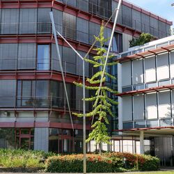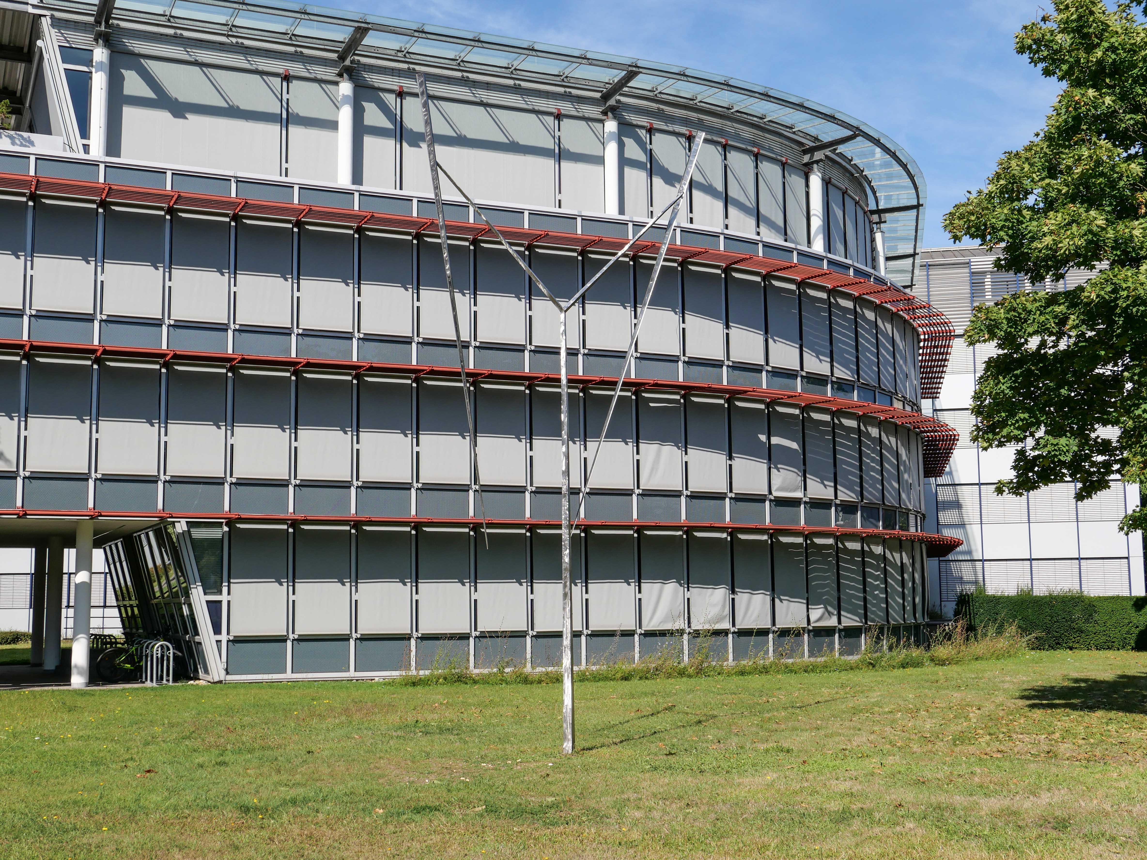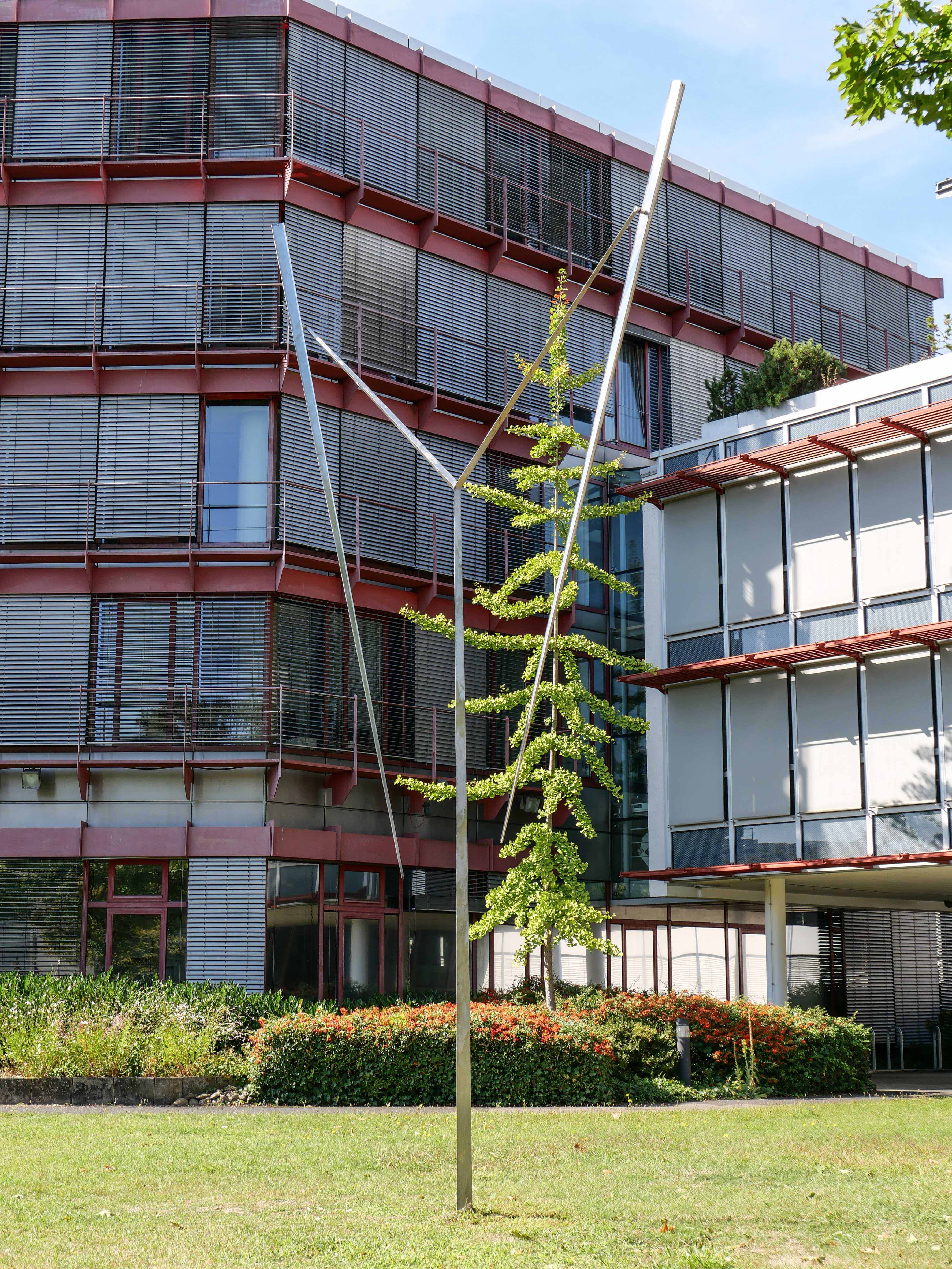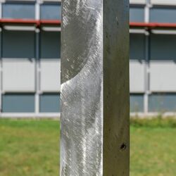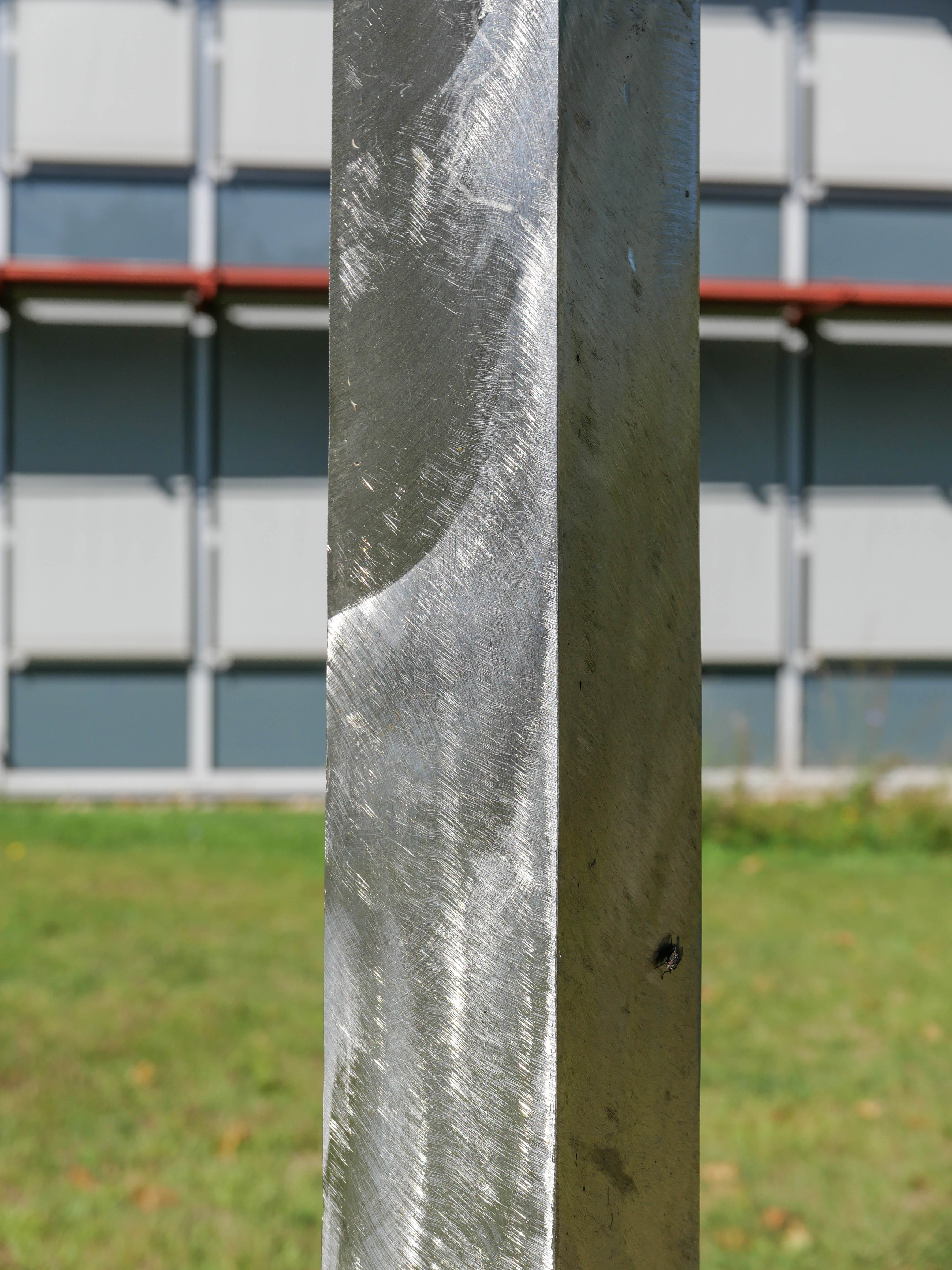 »Die ehemals links des DAAD-Eingangs platzierte kinetische Plastik besteht aus einer festen Achse in Y-Form, um die sich zwei schräg gestellte nadelförmige Arme durch Fixierung in Kugellagern frei bewegen können. Das Material ist rostfreier matter Stahl, dem durch Schliff winzige Rillen eingeprägt wurden, in denen sich das Licht mehrfach bricht. Diese „Zwei Linien schräg“ sind für eine Aufstellung im Freien besonders geeignet, da die Elemente nur durch den Wechsel des Lichts und der Windbewegungen zur Geltung kommen und in Bewegung gesetzt werden. Sie treffen aufeinander oder überschneiden sich. Der Betrachter darf sich auf immer neue Konstellationen geometrisch beschreibbarer Figuren - Dreieck, Quadrat, Zylinder, Kegel - einstellen.«