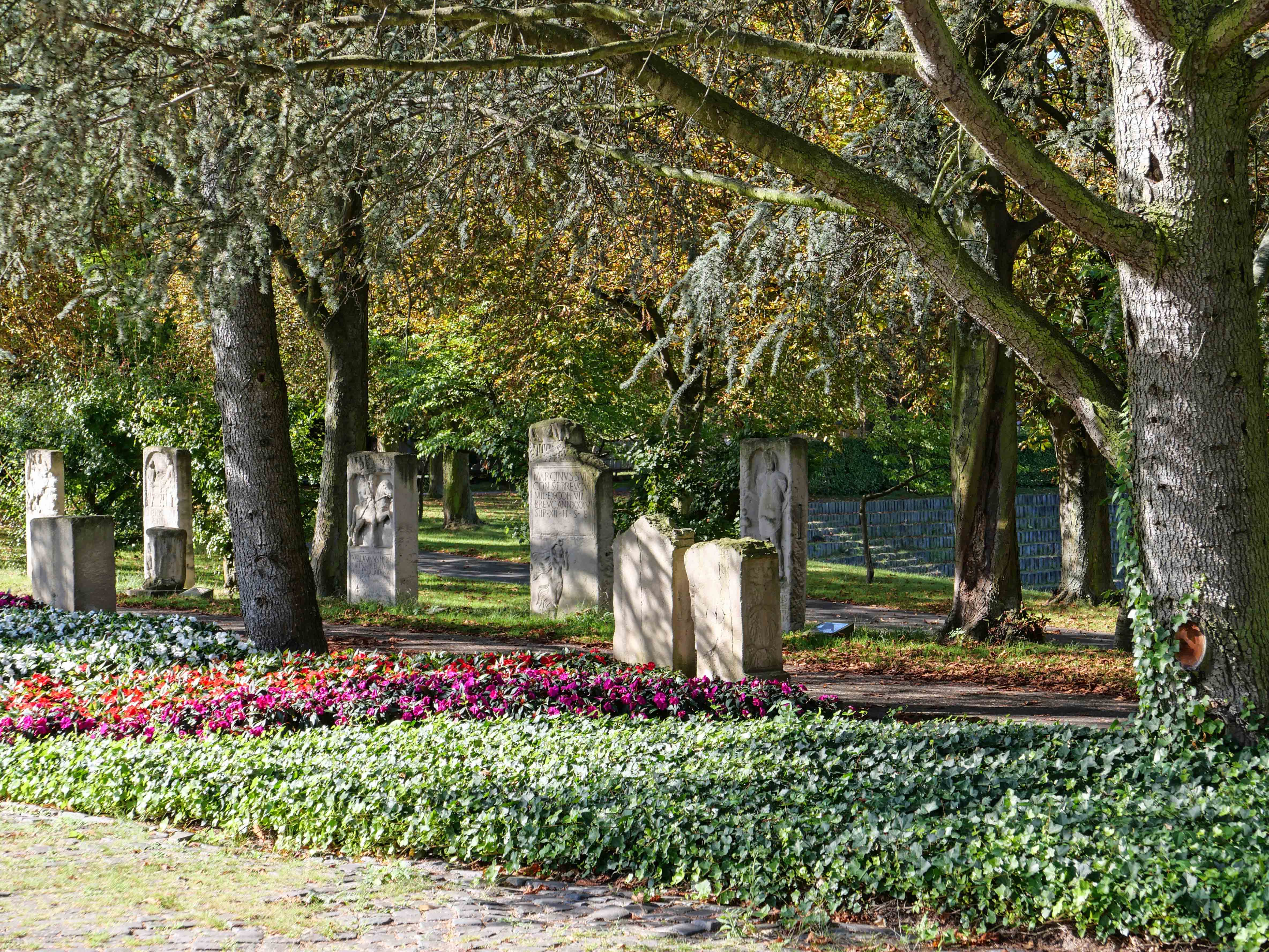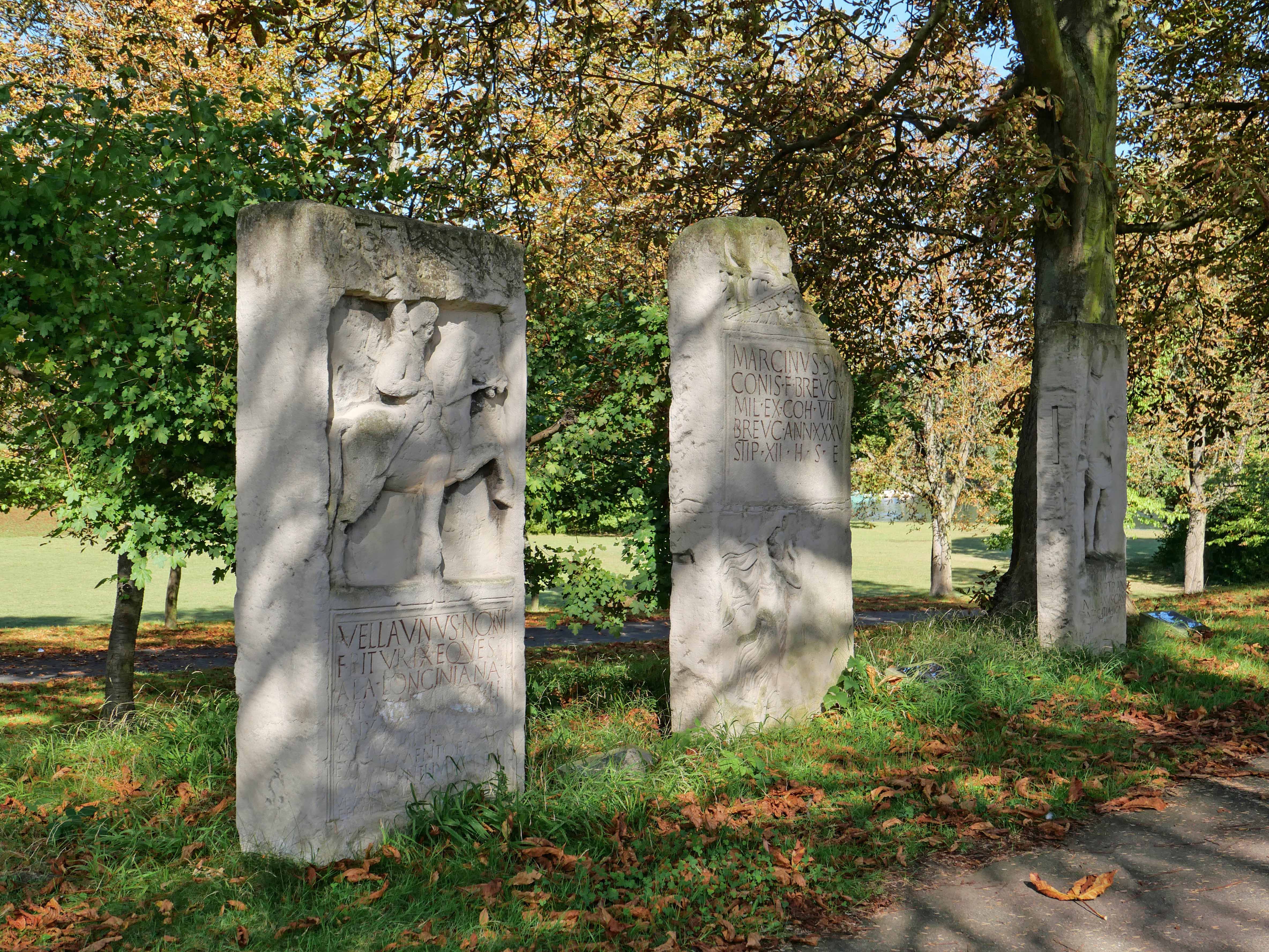 »100 Hektar des insgesamt 160 Hektar umfassenden Geländes des Rheinauenparks gehörten 1979 zur Bundesgartenschau, zu deren Anlaß damals auch die sogenannte „Römerstraße“ entstand, ein separater Abschnitt im Park, an dem rechts und links des Wegs 26 Abgüsse von römischen Grabsteinen und Altären aufgestellt wurden, die sich allesamt im Original im LVR-Landesmuseum Bonn befinden. (...)