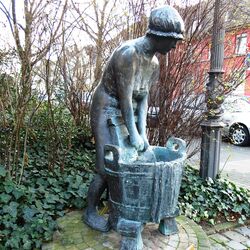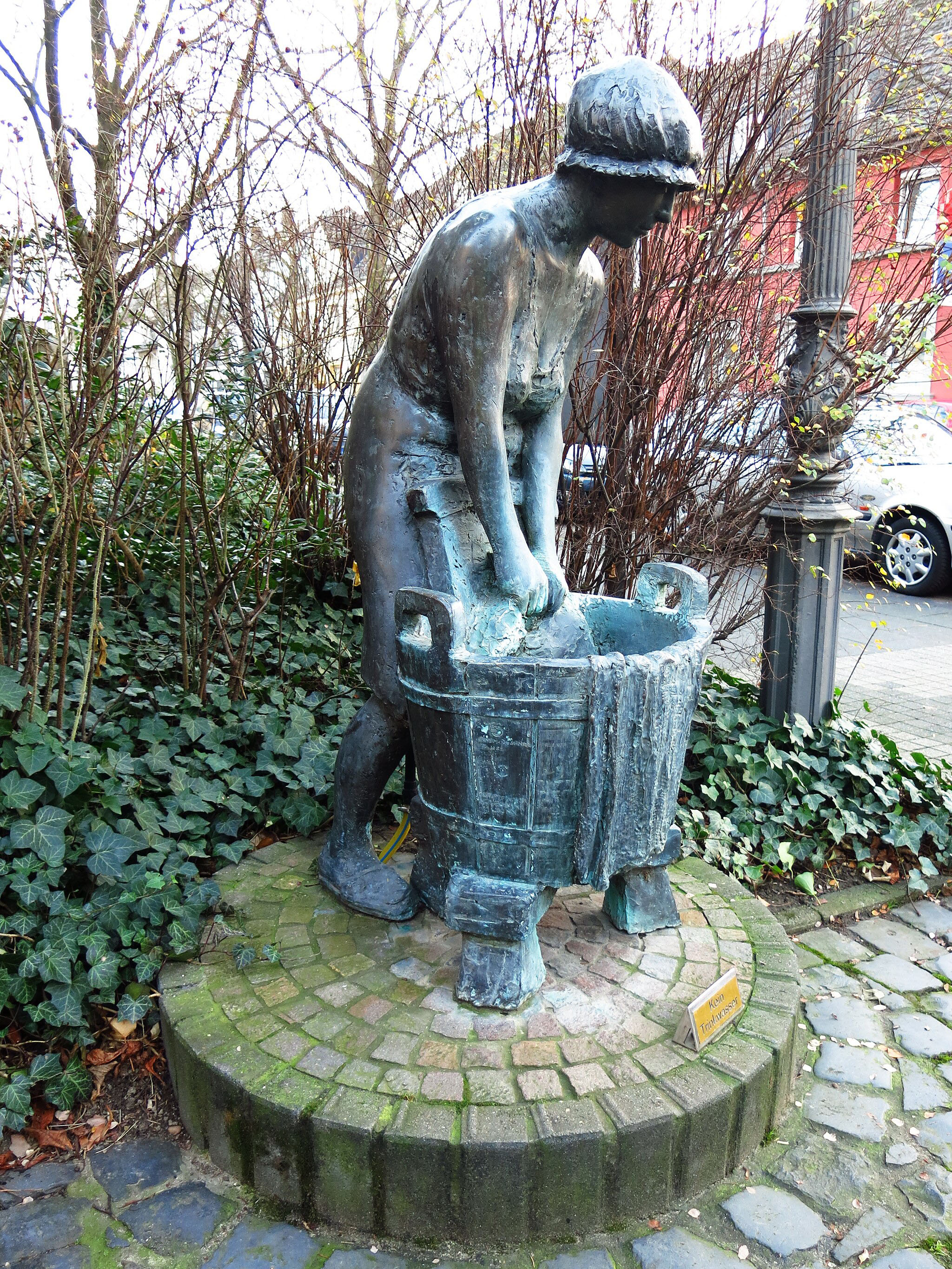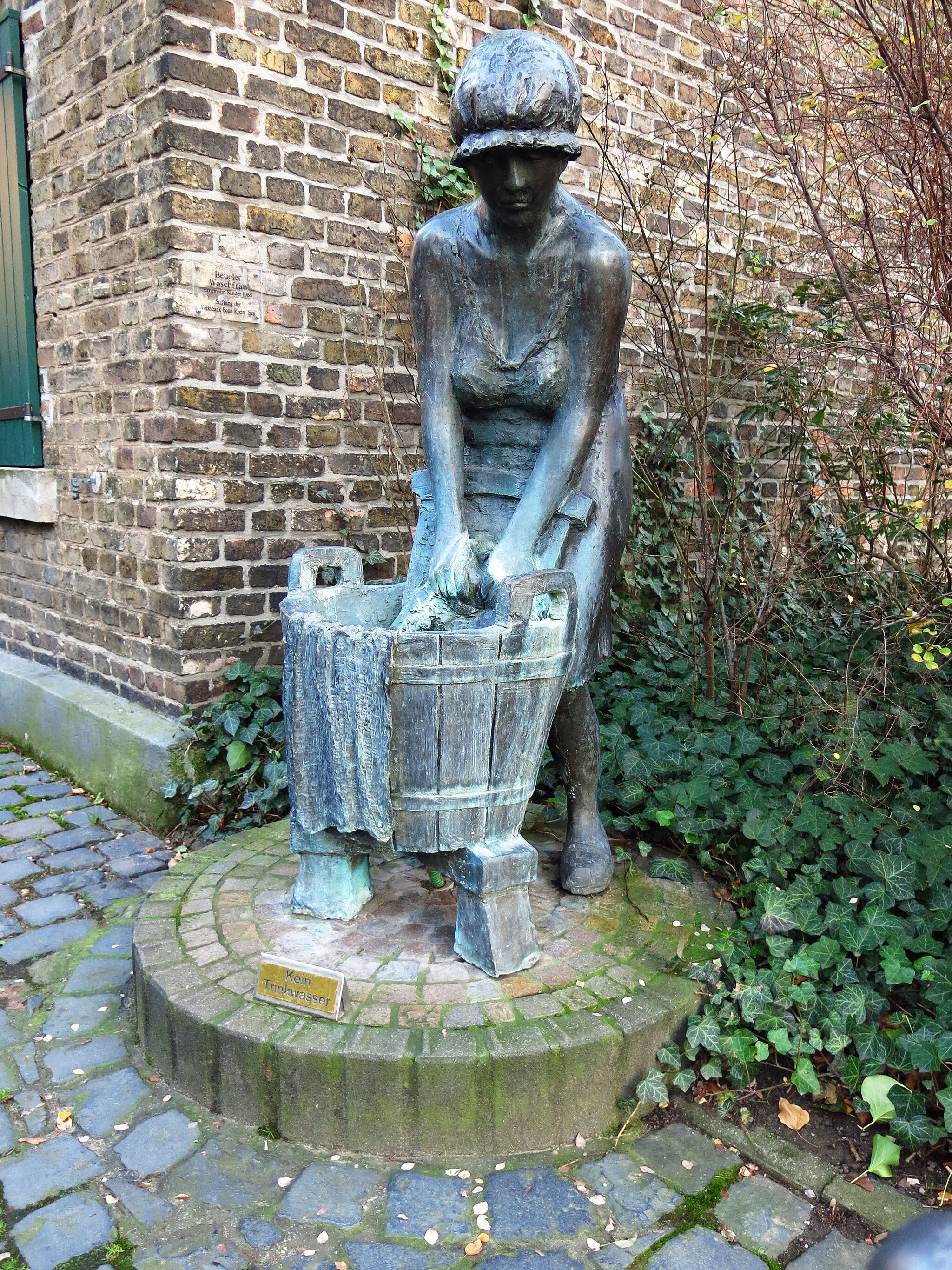 »Die etwas über lebensgroße Figur einer Wäscherin erinnert an das alte Gewerbe in diesem ehemaligen Wäscher- und Bleicherviertel. Die mühevolle Arbeit zeigt sich in der Haltung der Frau. Sie beugt sich - bekleidet wie im 19. Jahrhundert mit Haube, ärmellosem Kittel und offenen Pantinen - über den auf einem dreibeinigen Schemel stehenden Bottich und bearbeitet per Hand ein Wäschestück auf dem Waschbrett. Das Wasser rinnt dabei vom Bottichrand über das herabhängende Wäschestück. Vorbild für die Figur war nach Auskunft des Künstlers seine eigene Frau Hannelore, der er als Mutter von fünf Kindern ebenso ein Denkmal setzen wollte wie den früheren Wäscherinnen. Daher wird die Figur vom Bildhauer auch „Hannelore“ genannt. Die Idee zu dem Brunnen hatte das 1824 gegründete „Alte Beueler Damenkomitee“. Seit diesem Jahr erholen sich die Beueler Wäscherinnen an Weiberfastnacht von ihrer harten Arbeit.«