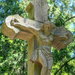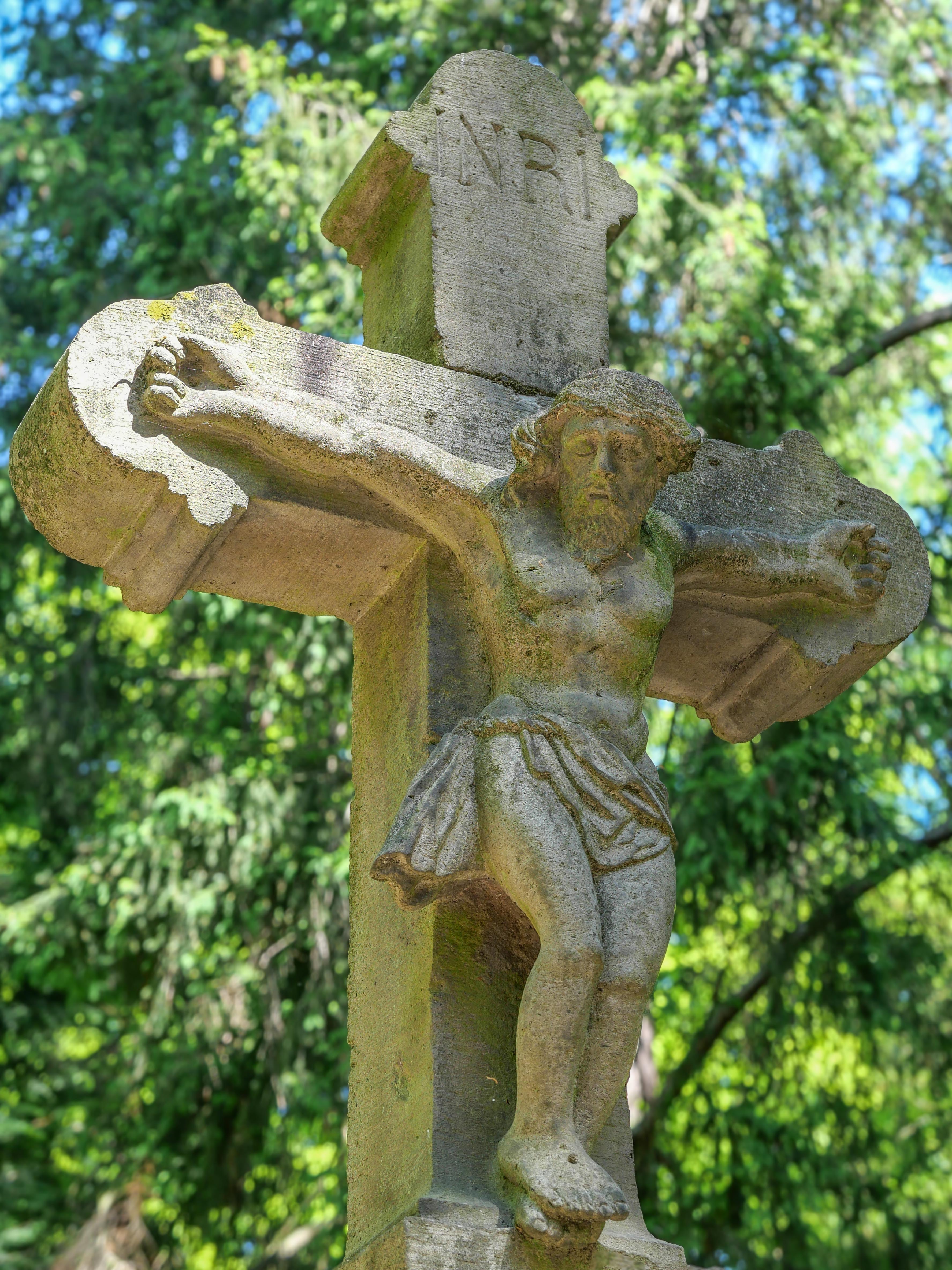 »Dieses schlichte Wegekreuz ist von 1686 und wohl auch von einem Müller gestiftet. Die gelungene Christusfigur ist mit dem Kreuzstamm aus einem Stück herausgemeißelt.«